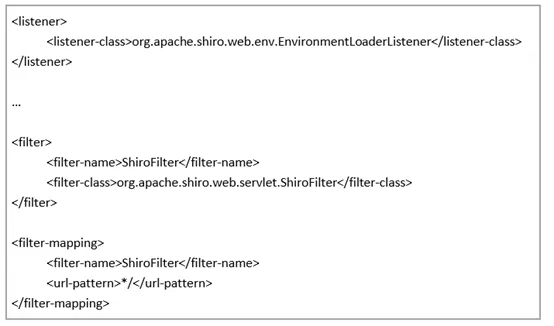 Shiro 1.2 and later 在 Shiro 1.2 及以后版本,标准的 Web 应用程序通过添加下面的 XML 块到 web.xml 来初始化 Shiro