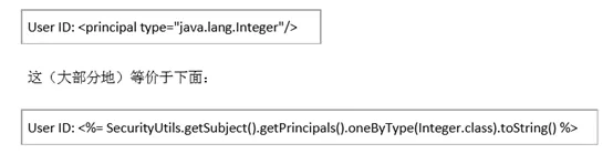 principal 标签默认情况下,假定该 principal 输出的是 subject.getPrincipal()的值。但若你想输出一个不是主要 principal 的值,而是属于另一个 Subject 的 principal collection,你可以通过类型来获取该 principal 并输出该值。 例如,输出 Subject 的用户 ID(并不是 username),假设该 ID 属于 principal collection: