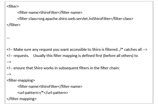它通常是可取的在任何其他 filter-mapping 声明之前定义 ShiroFilter filter-mapping,以确保 Shiro 也能在那些过滤器 下工作的很好。