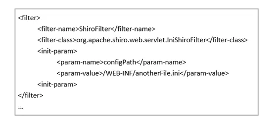 如果你不想将你的 INI 配置放在/WEB-INF/shiro.ini 或 classpath:shiro.ini,你可以指定一个自定义的资源位置,如果必 要的话。添加一个 configPath 的 init-param,并指定资源位置。