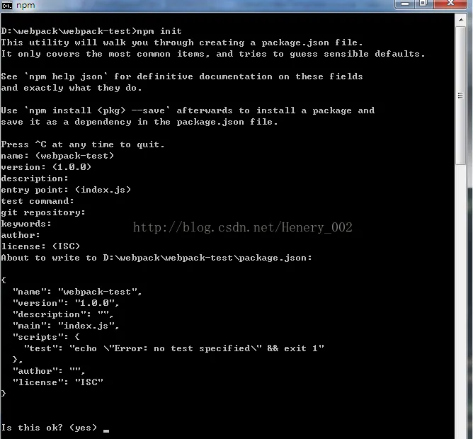 重新运行cmd(命令行创建子文件夹方法:mkdir webpack-test),初始化npm: