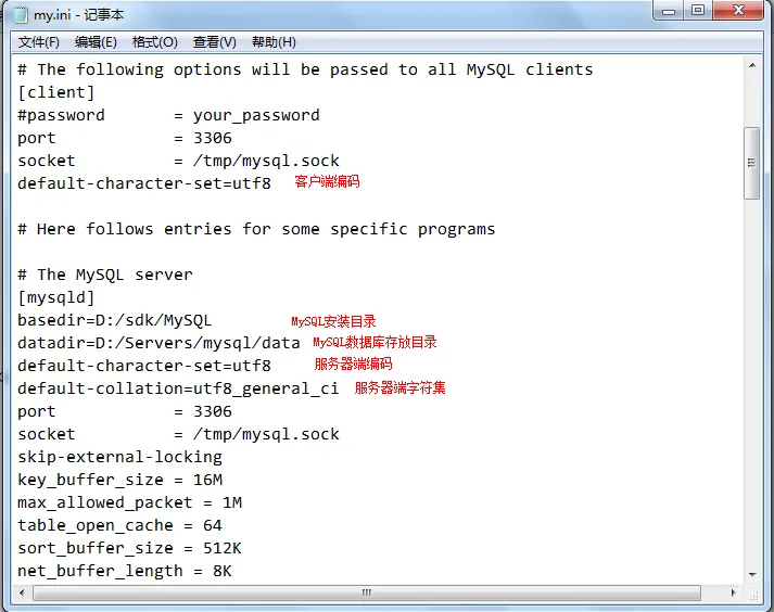 datadir=D:/Servers/mysql/data MySQL数据库存放目录