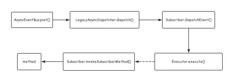 AsyncEventBus的dispatcher为LegacyAsyncDispatcher,executor为自己指定的线程池。运行流程如下: