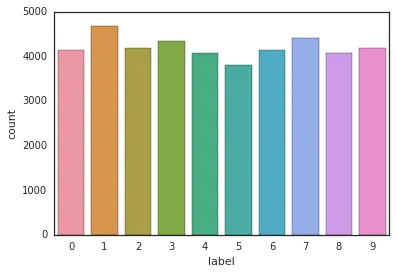Y_train = train["label"] #获得label X_train = train.drop(labels = ["label"],axis = 1) #获得label以外的东西,也即是数据 del train #没用了 g = sns.countplot(Y_train)