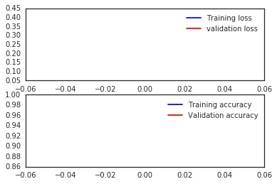 fig, ax = plt.subplots(2,1) ax[0].plot(history.history['loss'], color='b', label="Training loss") ax[0].plot(history.history['val_loss'], color='r', label="validation loss",axes =ax[0]) legend = ax[0].legend(loc='best', shadow=True) ax[1].plot(history.history['acc'], color='b', label="Training accuracy") ax[1].plot(history.history['val_acc'], color='r',label="Validation accuracy") legend = ax[1].legend(loc='best', shadow=True)