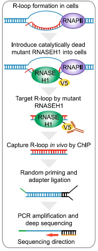 这篇文章就开发了一种新方法,基于RNase H的体内R-loop谱检测策略。作者构建一种没有催化活性,且在C端有一个V5标签的RNASE H1,RNASEH1与RNA/DNA结合,超声打碎,用anti-V5抗体进行染色体免疫共沉淀(ChIP)。随后RNA/DNA杂合体转换成双链DNA(ds-DNA), 之后便是链特异性测序。