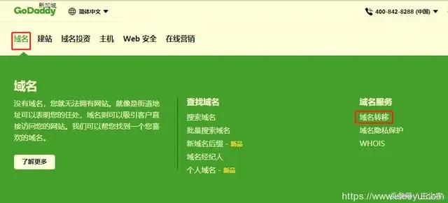 登陆GoDaddy账户,选择菜单栏“域名”这事你就能看到“域名服务”里面的“域名转移”。