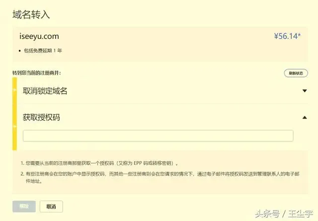 域名转移应该注意的两个问题,①解除锁定状态。②然后去原域名所有地申请转移秘钥(授权码)。