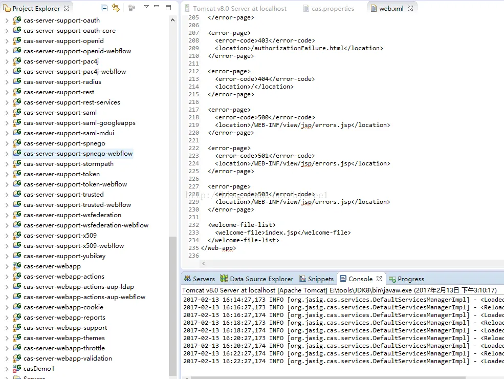 另外:cas.war中的\WEB-INF\classes\里面并没有class文件,实际上它是在\WEB-INF\lib\cas-server-*.jar四个jar里面的