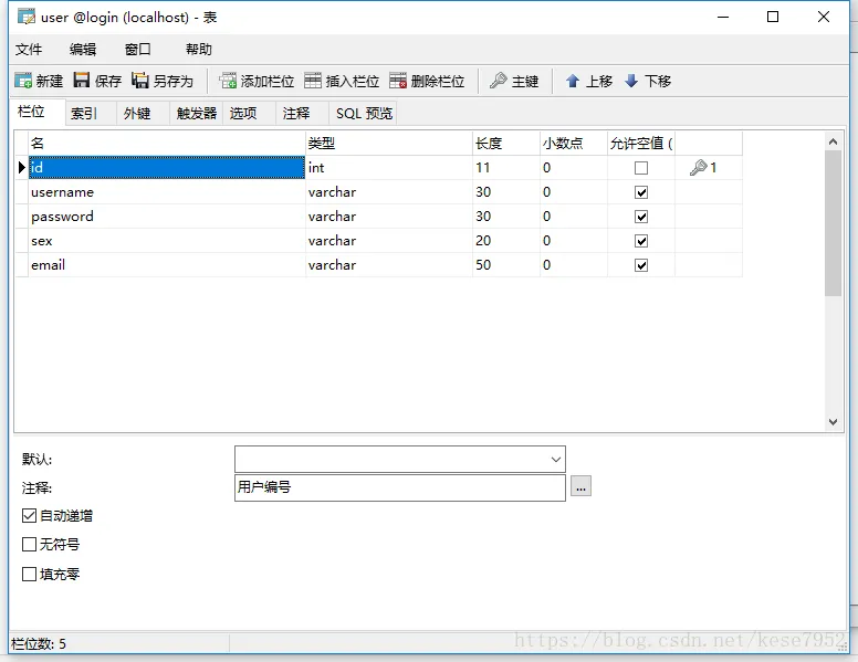 sex varcahr(50) -- 用户性别 [注:最后一个字段,不要再最后加入“,”]