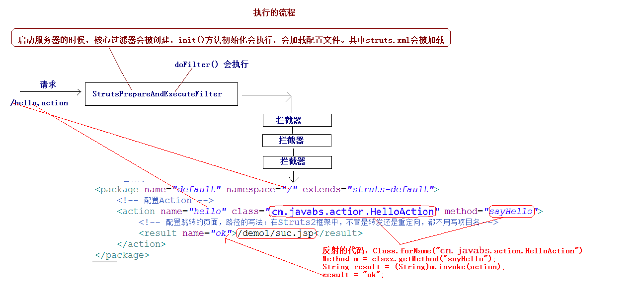 * 拦截器执行完后,会根据struts.xml的配置文件找到请求路径,找到具体的类,通过反射的方式让方法执行。