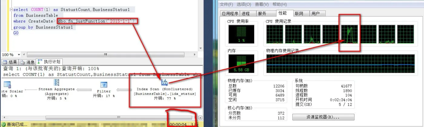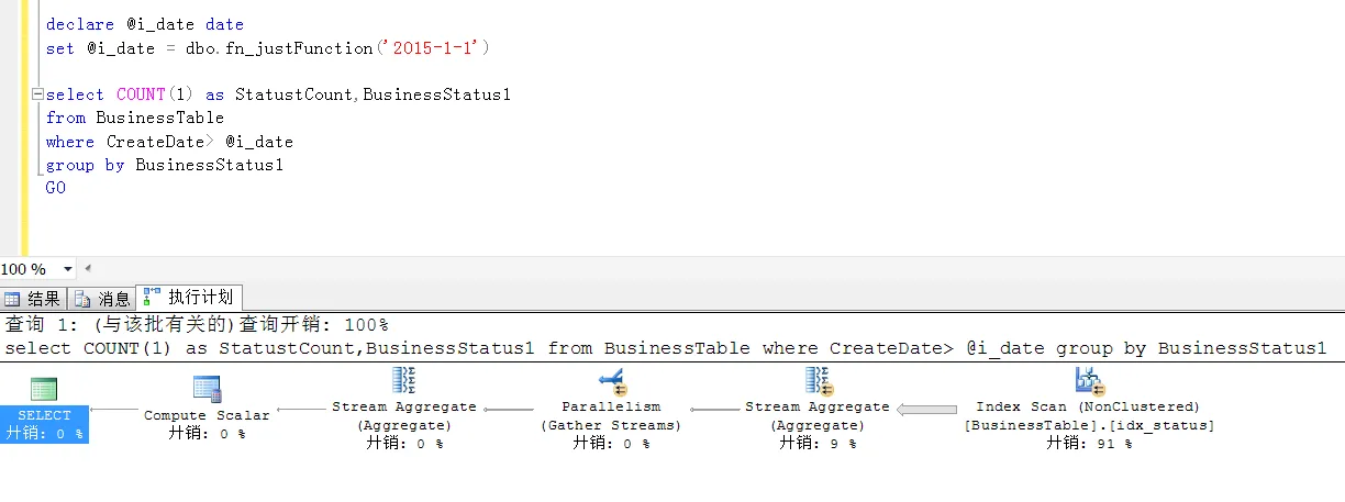 然后我们这么写这个查询,就是在查询条件上这么处理CreateDate>dbo.fn_justFunction('2015-1-1')(注意不是表的列,而是函数作用在查询条件上),