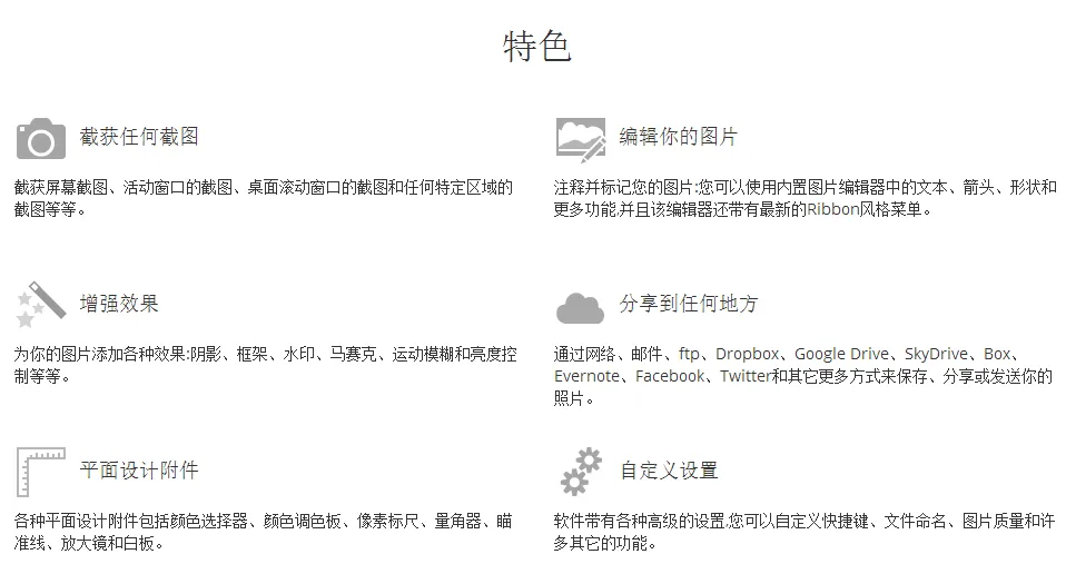 强大:是一款不可多得的多功能小工具,兼有各种模式的截图、屏幕录像、屏幕取色、屏幕标尺以及对图片的编辑功能!