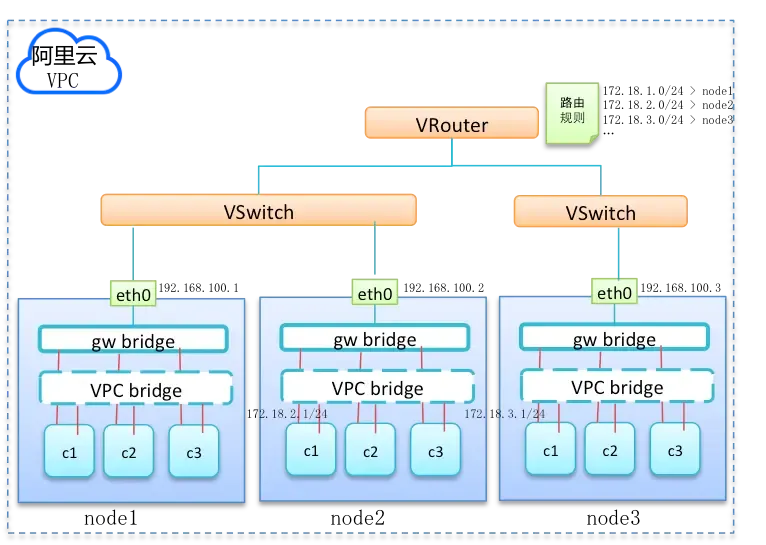 因此阿里云容器服务在VPC网络中针对Overlay网络做了性能的优化。在VPC网络模式下容器互通是结合了阿里云VPC服务的自定义路由的功能,通过Docker Network Plugin的配置容器的IP在固定的网段,下图是VPC+Docker的网络结构: