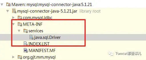 在JDK中规范了 Service Provider的路径,所有 Provider必须在JAR文件的META-INF/services目录下包含一个文件,文件名就是我们要实现的Service的名称全路径。比如我们熟悉的JDBC 的MySQL实现, 在mysql-connector中,就有这样一个文件