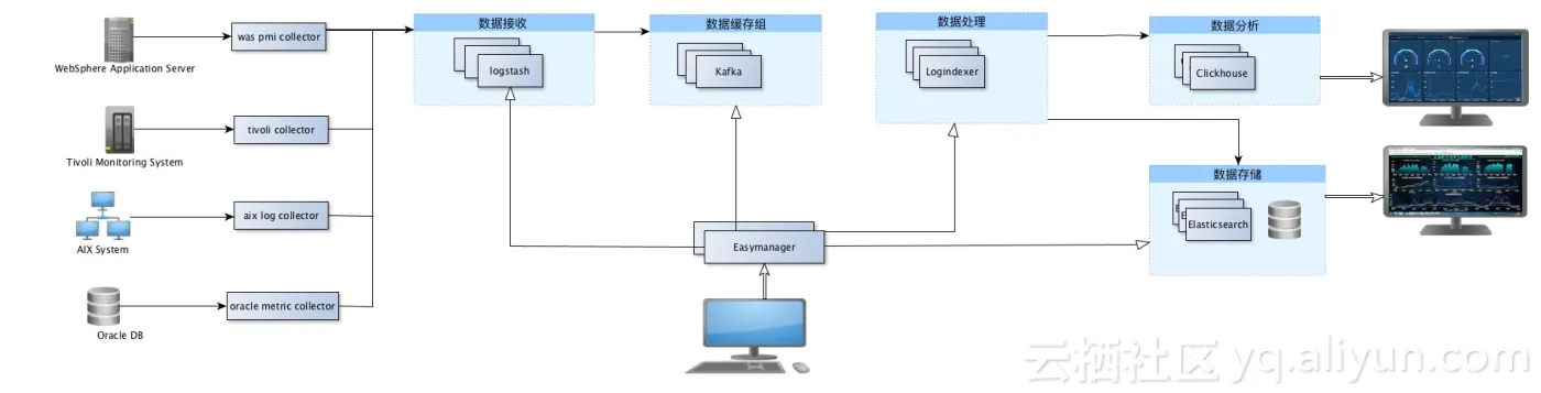 坚持看到这里就是真爱了,贴上一张系统架构图,图中左方是数据采集层,easymanager是公司自研的自动部署神器(不用想了,没有开源),右边是数据展示端,把应用、主机、数据库、日志数据统一展示在一张大屏上,废话不说了,上菜!