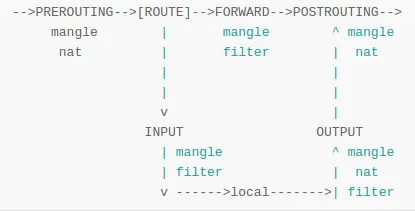 - 如果数据包就是进入本机的(即数据包的目的IP是本机的网口IP),数据包就会沿着图向下移动,到达INPUT链。数据包到达INPUT链后,任何进程都会-收到它