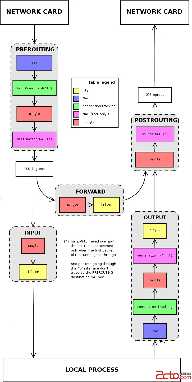 主要用于修改数据包的TOS(Type Of Service,服务类型)、TTL(Time To Live,生存周期)指以及为数据包设置Mark标记,以实现Qos(Quality Of Service,服务质量)调整以及策略路由等应用,由于需要相应的路由设备支持,因此应用并不广泛。包含五个规则链——PREROUTING,POSTROUTING,INPUT,OUTPUT,FORWARD。
