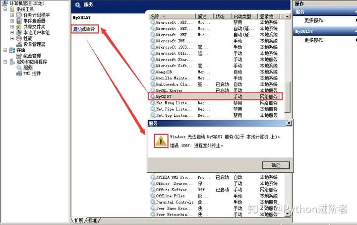 1、其中一个是:Windows无法启动MySQL57服务(位于本地计算机上)错误1067:进程意外终止,报错如下图所示。