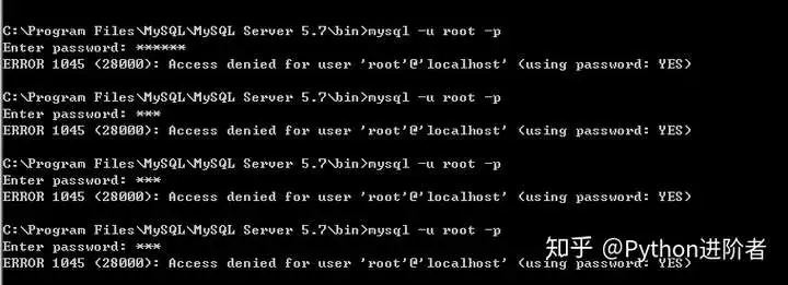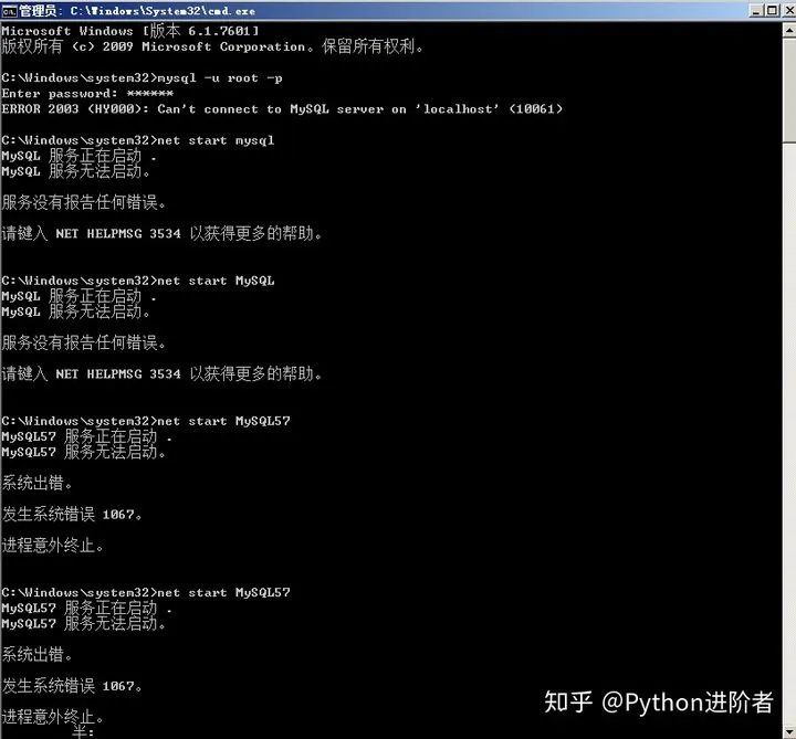 3、之后即便我垂死挣扎,在命令行窗口中不断的重启MySQL服务,但是仍然没有戳到痛点,尝试的步骤有下图为证。