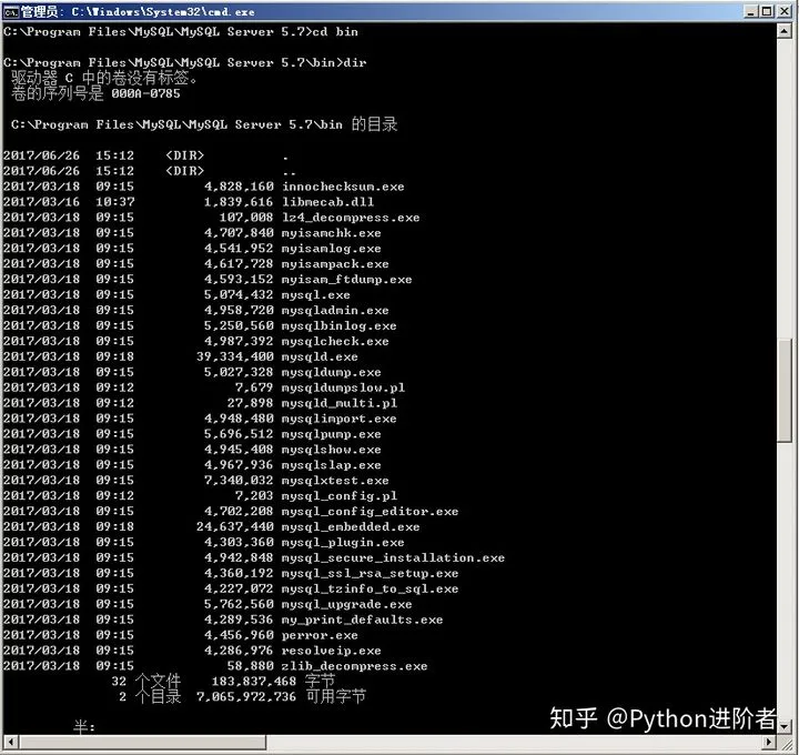 7、之后进入到MySQL安装目录下,找到bin目录,这个过程是必须的。这个过程很简单,一路上使用cd命令和dir查看目录文件的命令相互结合,直到进入到bin目录下为止。一般来说,MySQL的安装默认路径是:C:\Program Files\MySQL\MySQL Server 5.7\bin,大家可以做下参考。
