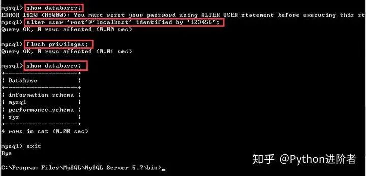 14、这个报错的意思是告诉你重设密码,此时只需要输入命令重新设置密码即可。至于MySQL重设密码的方法网上有很多,在这里不展开讲述了,小编用的语法是:alter user 'root'@'localhost' identified by '123456';,其中123456是重设的密码,大家可以自定义的,顺利设置完成之后记得刷新权限:flush privileges;,尔后你就可以正常操作数据库了。该步骤的具体操作过程如下图所示。