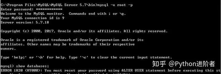13、但是直接输入MySQL的简单命令之后,发现并不能操作数据库,会提示报错:ERROR 1820 (HY000): You must reset your password using ALTER USER statement before executing this statement.,如下图所示。