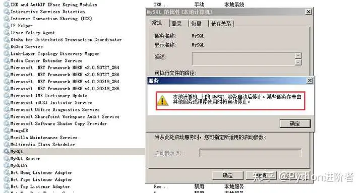 2、紧跟着还有一个报错:本地计算机上的MySQL服务启动后停止。某些服务在未由其他服务或程序使用时将自动停止,报错如下图所示。
