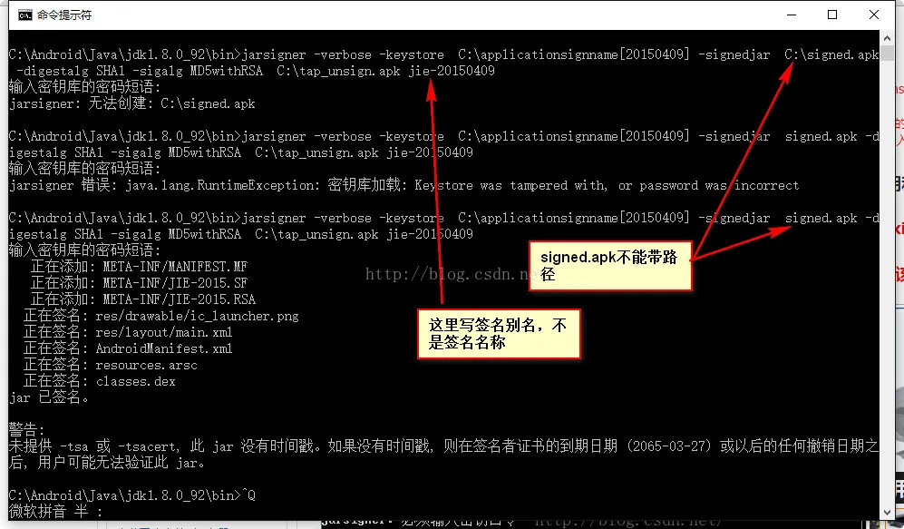 jarsigner -verbose -keystore C:\applicationsignname[20150409].keystore -signedjar signed.apk -digestalg SHA1 -sigalg MD5withRSA C:\tap_unsign.apk jie-20150409