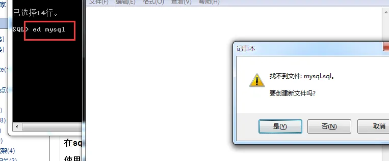 在命令窗口执行ED MYSQL时,因为我本地没有这个文件,所以会直接弹窗提示,我们点击确定,便可以进行编写,此时我们在记事本中编写sql语句时,sqlplus处于阻塞状态