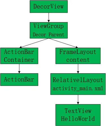- 看到这里,大家一定看见了一个非常熟悉得布局----ContentView。它是一个ID为content的FrameLayout,activity_main.xml就是设置在这样一个Framelayout里。通过以上过程,我们可以建立起这样一个标准视图树,如下图所示。