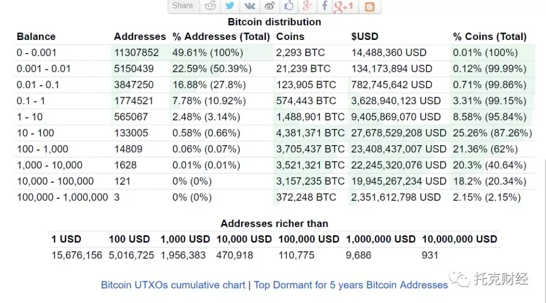 比特币地址中,前三排地址数量庞大,但也只占BTC总量的85%左右,而后三排只有0.01%左右的地址就占据了40%的财富。太过现实的真相告诉我们,比特币中大约40%的财富,掌握在了1744个人的手里。如果这些鲸鱼中的一部分人开始抛售大量BTC,那么市场将面临无法控制的局面。这也是各家财经都在监测比特币富豪榜中交易去向的原因。
