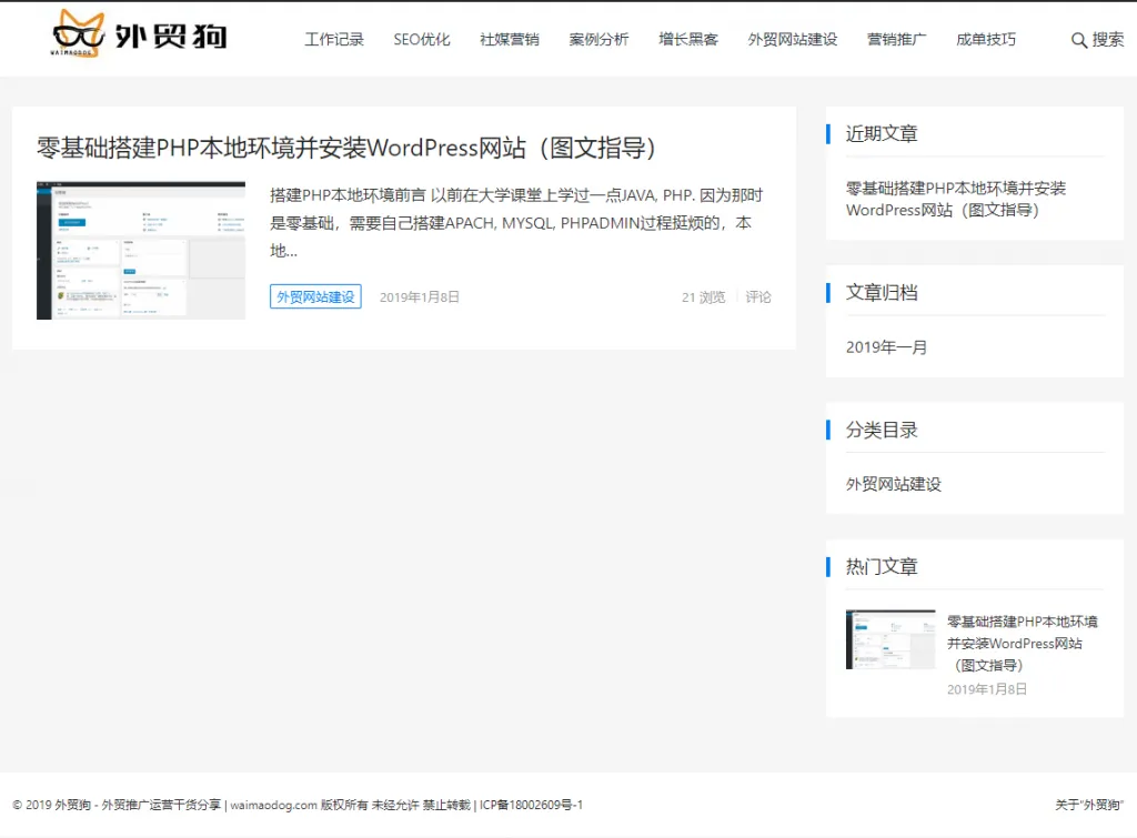 我自己主做海外独立站的运营推广工作,首先必须得有记录我的工作的板块,我这个“外贸狗”就是做外贸营销推广相关干货知识分享的,所以我网站必须和我自己牛逼的地方挂钩: