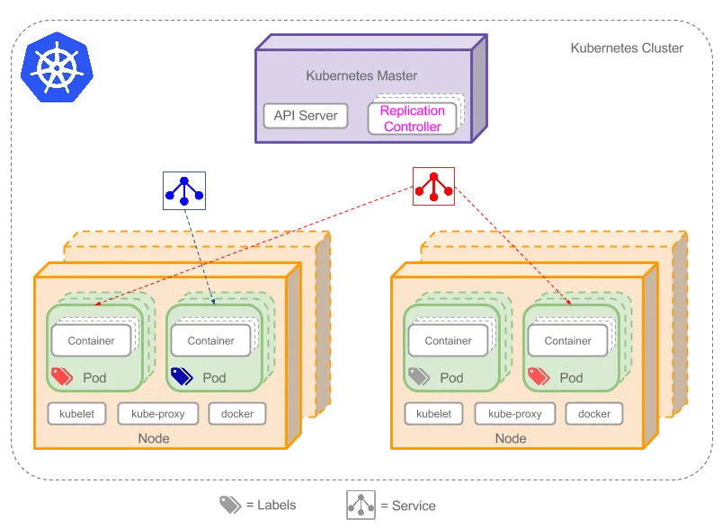 集群拥有一个Kubernetes Master。Kubernetes Master提供集群的独特视角,并且拥有一系列组件,比如Kubernetes API Server。API Server提供可以用来和集群交互的REST端点。master节点包括用来创建和复制Pod的Replication Controller。