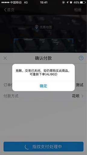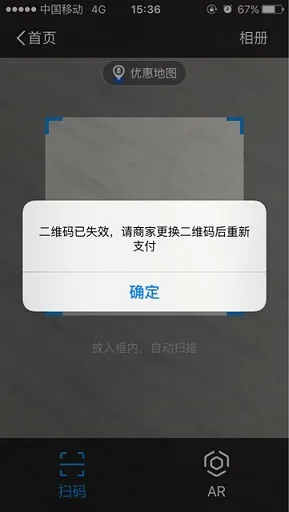 3.A用户使用支付宝扫码二维码生成订单后 ,B用户再去扫描同一二维码则会报“二维码已失效,请商家更换二维码后重新支付”