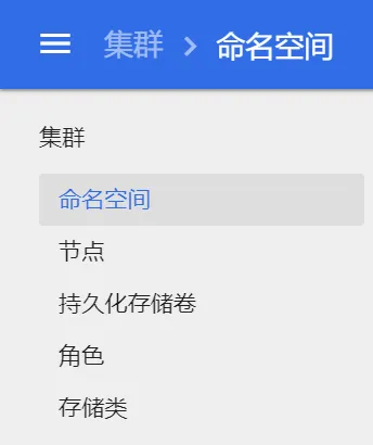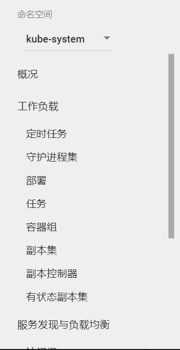 Dashboard左部为导航菜单区域,通过导航菜单可以查看和管理集群中的各种资源: