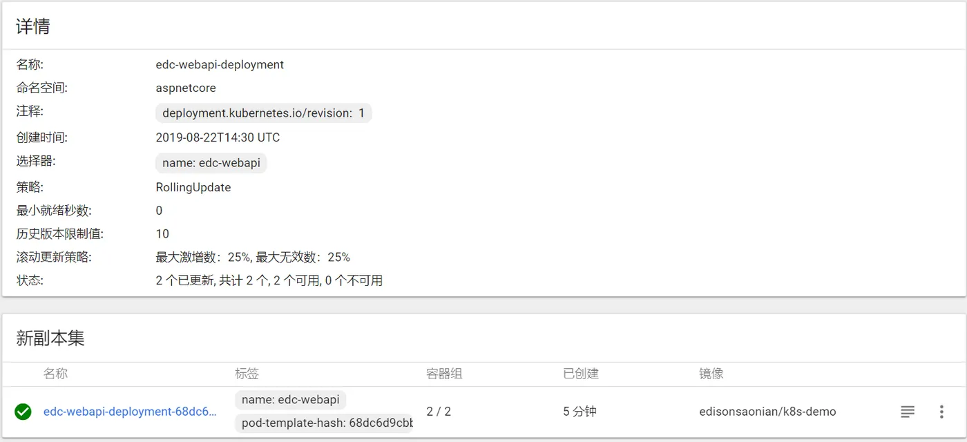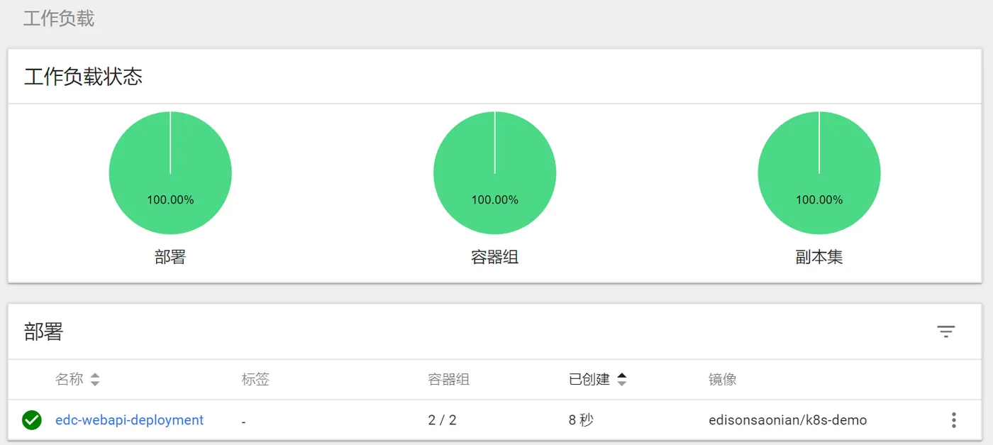 通过YAML配置文件上传的话,可以部署Deployment、DaemonSet、Job等各种类型的资源,并且足够快速。下图是点击上传之后跳转到具体Deployment之后的效果:
