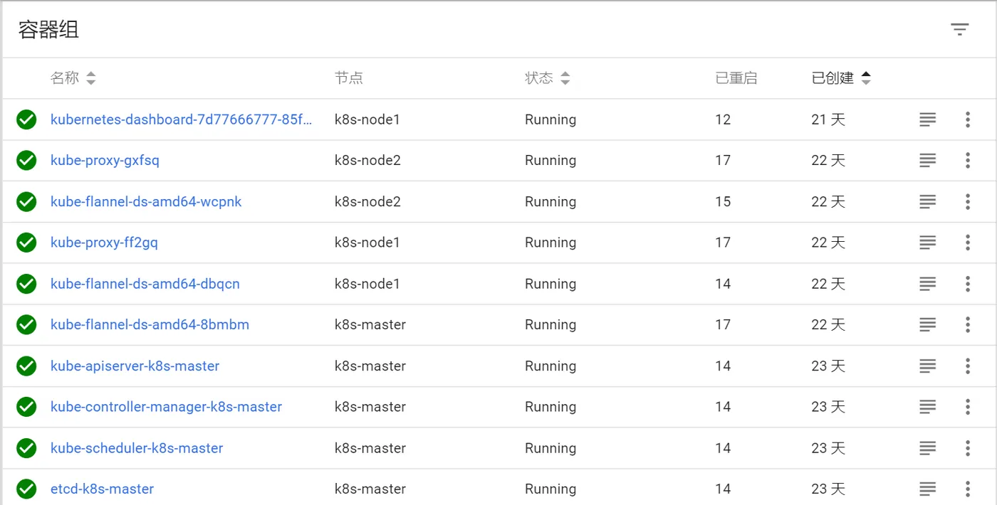 在导航菜单中选中了具体的某类资源,中间主题区就会显示该资源所有的示例。下图就是选择容器组(Pods)后的主体区域内容: