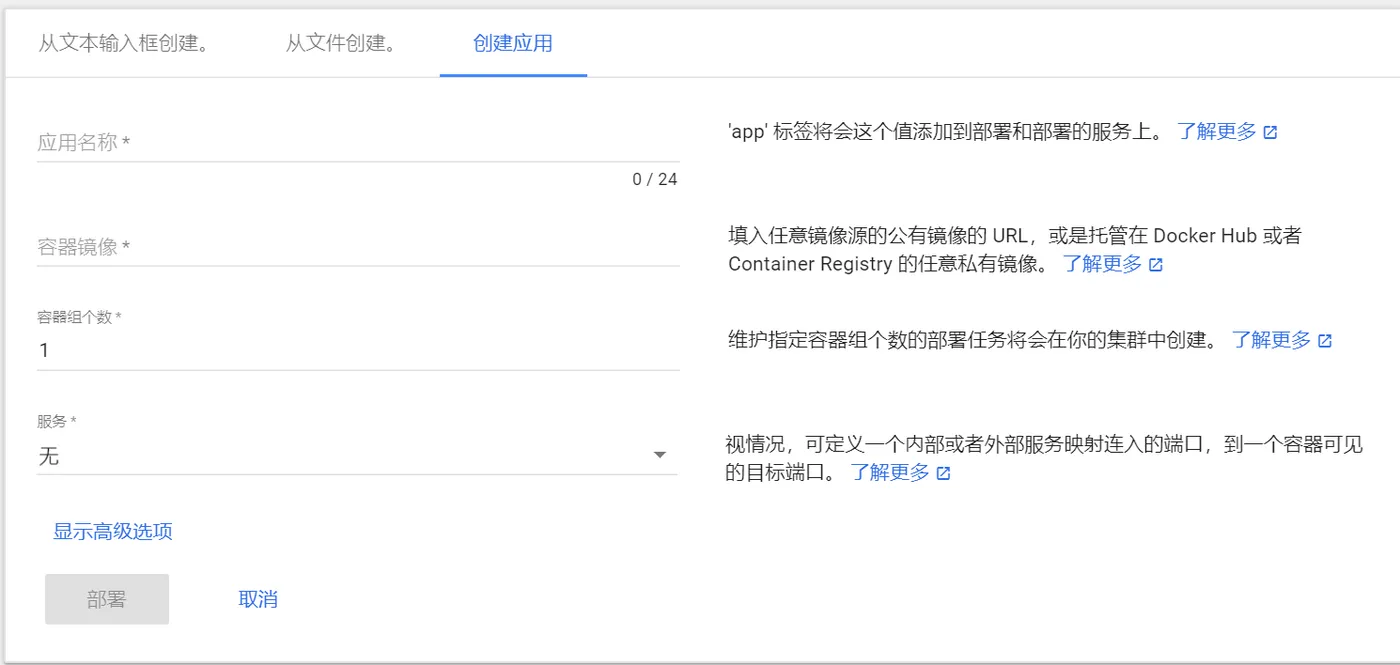 可以看到,我们可以直接在Web界面中输入我们要部署的应用的一些信息,比如输入名字,选择镜像,设置副本数等等等等。