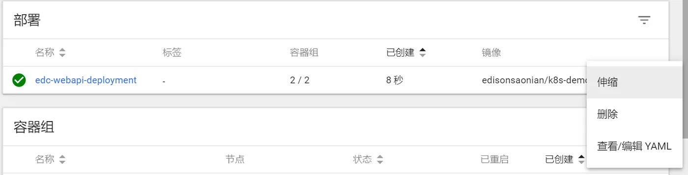 可以看出,我们可以对刚刚上传的Deployment进行伸缩(Scale Up)、删除以及查看/编辑YAML配置文件。