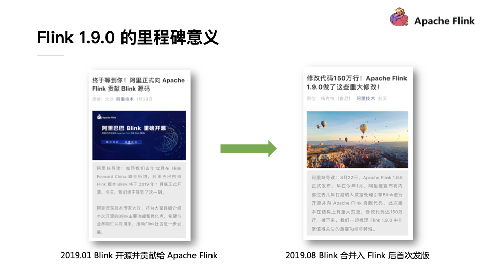 下图展示的是在2019年中阿里技术微信公众号发表的两篇新闻,一篇为“阿里正式向Apache Flink贡献Blink代码”介绍的是在2019年1月Blink开源并且贡献给Apache Flink,另外一篇为“修改代码150万行!Apache Flink 1.9.0做了这些重大修改!”介绍的是2019年8月Bink合并入Flink之后首次发版。之所以将这两篇新闻放在一起,是因为无论是对于Blink还是Flink而言,Flink 1.9.0的发版都是具有里程碑意义的。