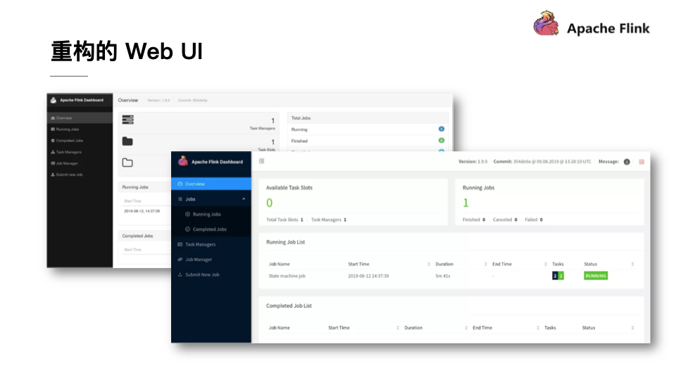除了上述功能的改进之外,Flink 1.9.0还提供了如下图所示的焕然一新的Web UI。这个最新的前端UI由专业Web前端工程师操刀,采用了最新的AngularJS进行重构。可以看出最新的Web UI非常的清新和现代化,也算是Apache开源软件里面自带UI的一股清流。