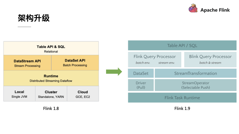 整体而言,如果一个软件系统产生了较大改动,那基本上就是架构升级带来的,对于Flink而言也不例外。想必熟悉Flink的同学对于下图中左侧的架构图一定不会陌生,在Flink的分布式流式执行引擎之上有一整套相对独立的DataStream API和DataSet API,它们分别负责流计算作业和批处理作业。在此基础之上Flink还提供了一个流批统一的Table API和SQL,用户可以使用相同的Table API或者SQL来描述流计算作业和批处理作业,只需要在运行时告诉Flink引擎以流模式运行还是以批模式运行即可,Table层将会把作业优化成为DataStream作业或者DataSet作业。但是Flink 1.8版本的架构在底层存在一些弊端,那就是DataStream和DataSet在底层共享的代码并不多。其次,两者的API也完全不同,因此就会导致上层重复开发的工作量比较大,长期来看就会使得Flink的开发和维护成本越来越大。