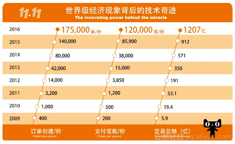 2009年,双十一诞生。当时,整个技术部门只有几个人被临时安排值班,高峰每秒只有400个请求。
