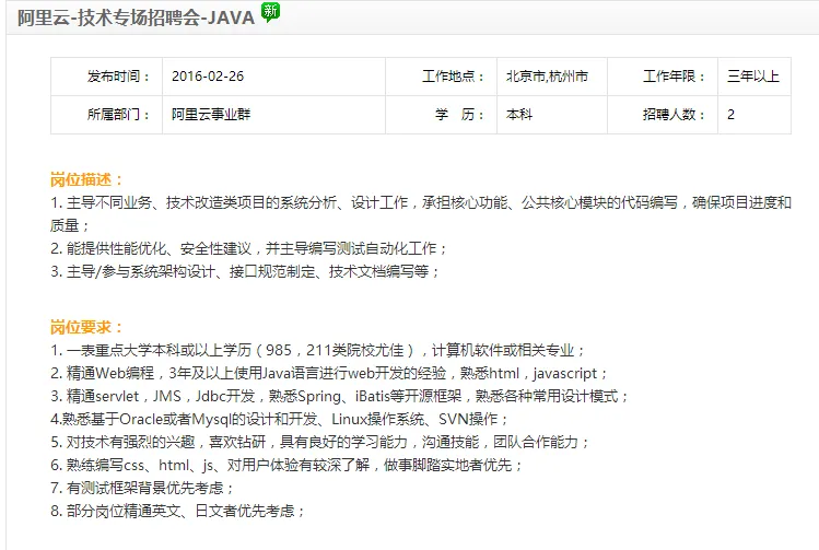 阿里的Java工程师招聘信息多达57页(果然多…),我找了阿里云方向的招聘要求和大家分享一下,大家参照这个可以有一个更加明确的努力方向: