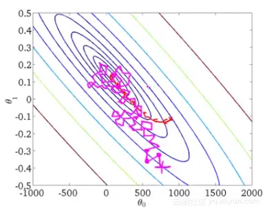 如下图所示,随机梯度下降法不像批量梯度下降法那样收敛,而是 游走到接近全局最小值的区域终止。小批量梯度下降法原理