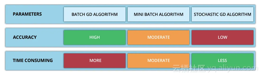 基于如何使用数据计算代价函数的导数,梯度下降法可以被定义为不同的形式(various variants)。确切地说,根据使用数据量的大小(the amount of data),时间复杂度(time complexity)和算法的准确率(accuracy of the algorithm),梯度下降法可分为: