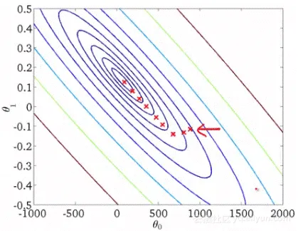上图是每次迭代后的等高线图,每个不同颜色的线表示代价函数不同的值。运用梯度下降会快速收敛到圆心,即唯一的一个全局最小值。