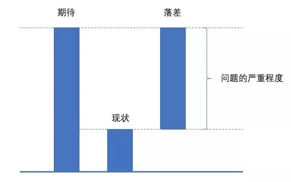 当我们明确地定义问题之后,我们就要设定目标来解决这个问题,但是现状是残酷的,我们目标和现状之间可能存在巨大的落差,这个落差的程度就是问题的严重程度,所以说:问题的严重程度是希望(目标)与现实的落差!