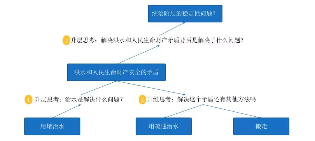 当问题升层思考之后,前面的问题会变成手段/方法,比如说洪水和人民生命财产的矛盾背后的问题是社会的稳定性问题(1和2是升层思考),而升维思考洪水和人民生命财产的矛盾的时候就会发现用疏通治水或者搬走都是方案(3是升维思考)。
